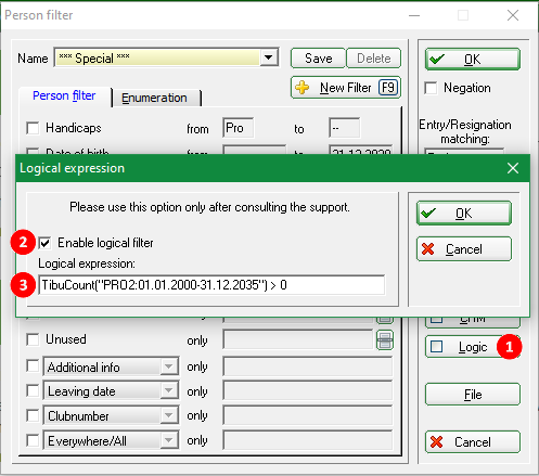 With the buttons below Special filtering on the right-hand side of the definition window, you can also restrict groups of people to certain tournaments, bookings or sales.
