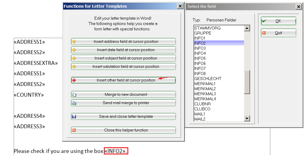 • Only with the special parameter are the fields for the key numbers for the other fields in the mail merge function.