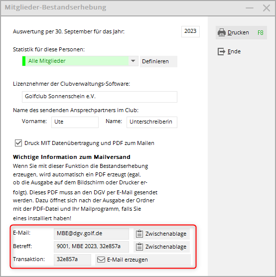 You can print the statistics as often as you like. The data is transferred each time and labelled with a transaction ID. DGV only uses the data that you have authorised and sent by e-mail. The transaction identifier is used for identification, which, in addition to the date Created at the bottom of the information block of the last printed statistics.