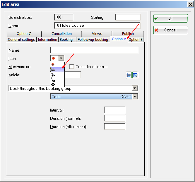 The ICONS for CARTS can also be displayed with a CART instead of the red dot. There are also icons for trolleys or rental clubs.