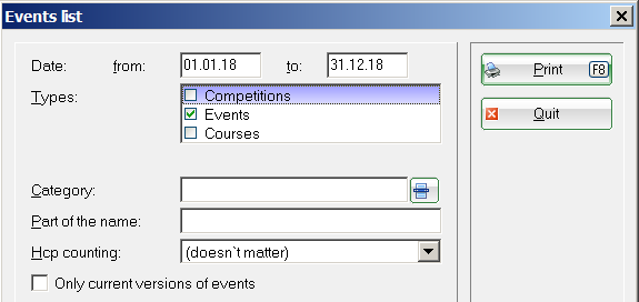 Lists of competitions, events and courses are to be printed as separate events in lists: