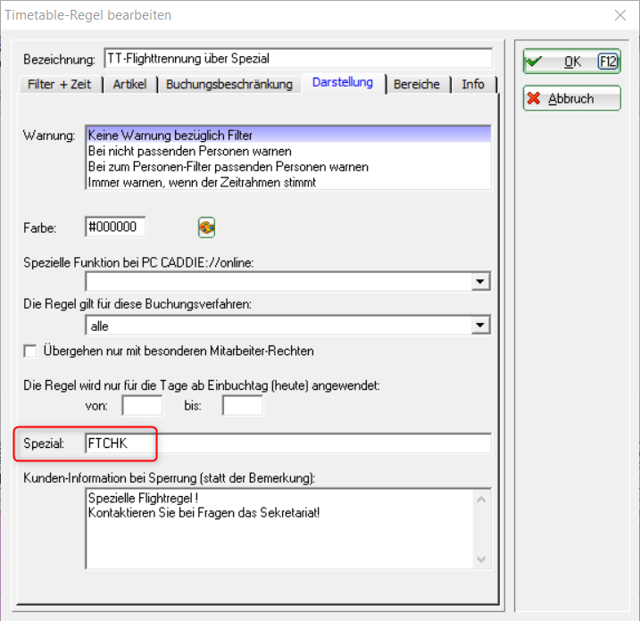 You can define timetable rules / booking restrictions in PC CADDIE under the menu item Timetable/Define timetable rules or in the timetable using the key combination Ctrl + F11