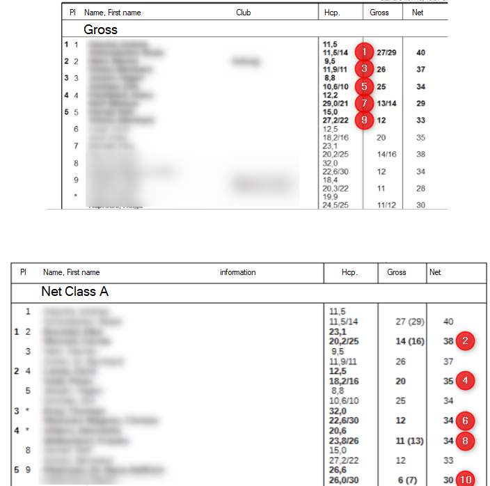 If you have created all the prizes according to your invitation, it could look like this (according to our example): 1st gross ladies and 1st gross men 1st - 3rd net class A/B/C