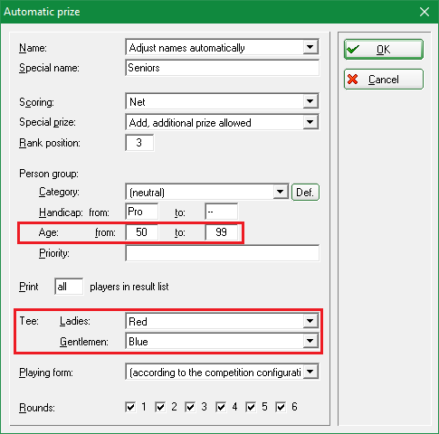 If you set different tees for a certain group of people (e.g. age or person filter for the category) in the price setting than in the basic tournament settings, these players will be scored completely with this tee. The scorecards are then already printed with this tee. It is then not necessary to make individual settings in the player editor.