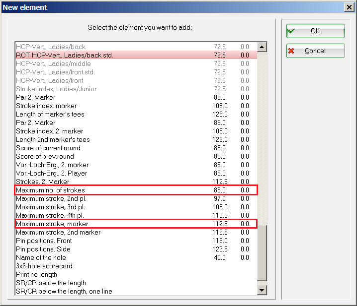 To do this, select the appropriate scorecard elements and set the position next to the handicap lines. The maximum number of strokes per hole is determined from the par of the hole and the handicap: