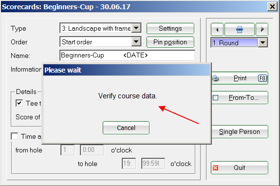 The printout is usually started with Print (F8) to start the printout. All scorecards are then printed out one after the other. If the printout was interrupted in between and is to be continued later from a certain player, please use the button From-To…:
