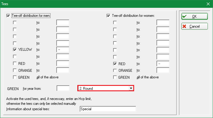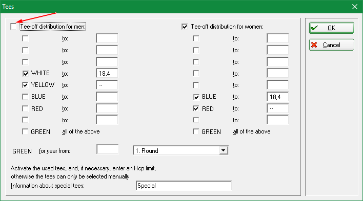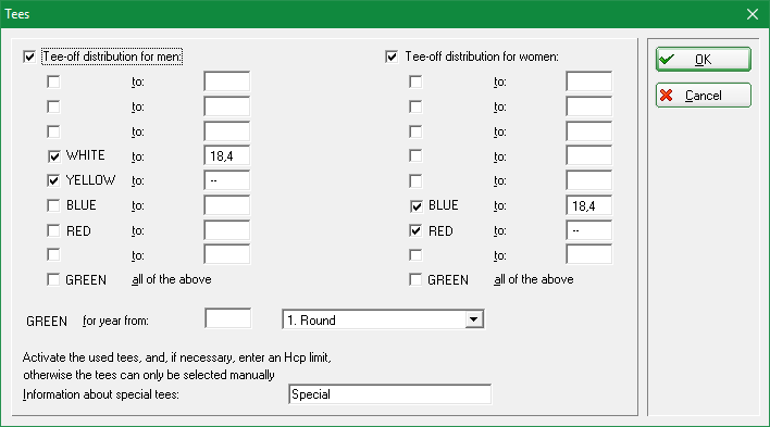 With Hcp limit of the tees you define which players are to be counted from which tees. The limits are defined separately for men and women.