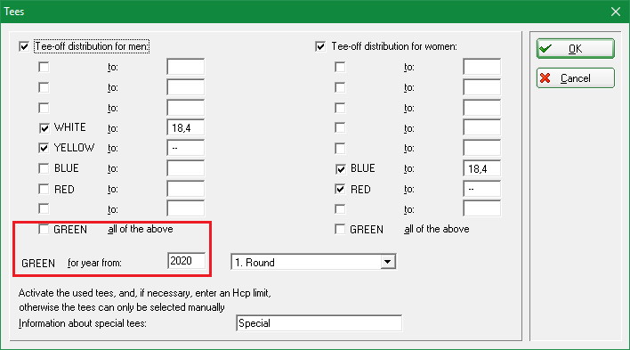 Note: „GREEN from vintage“ is displayed if the green tee is rated for only one course, e.g. with different courses per round. However, the green tee could of course only be calculated for the round with a green rating (this variant would be very unusual for multi-round tournaments).