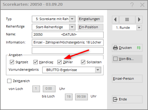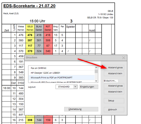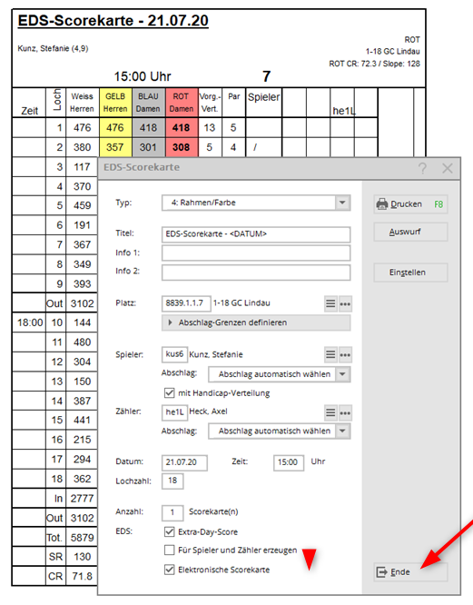 In the following it is important that you also print the scorecard for the counter (even if you do not need it). The EXPORT fields for the DGV Extranet, which are necessary so that the counter can then confirm the player's score, can only be generated by printing the counter score card.