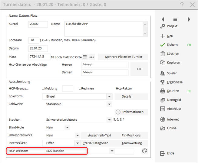 Tip: If you do not want to display the EDS „tournaments“ on the INTERNET, you can still upload the start list. Use the setting HIDE under „Internet“.
