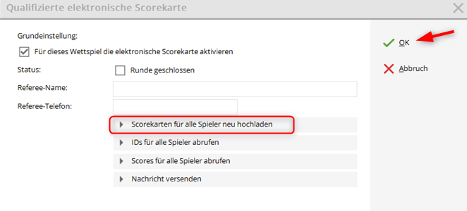 „Upload new scorecards for all players“ set directly in the tournament settings is only necessary in exceptional cases, for example, after changes to the games.