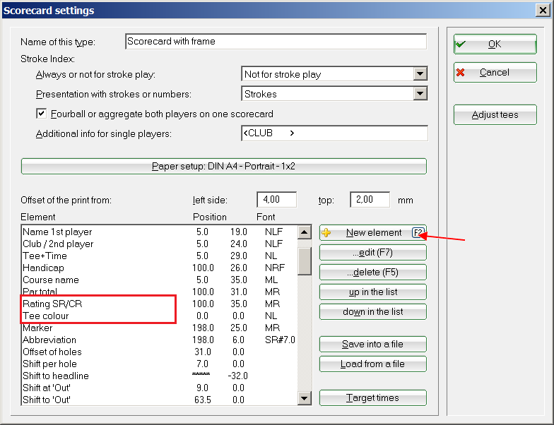 Finally, add the slope and course rating values in the scorecard header with Free positioning. The elements „CR/SR…“ can be selected and positioned using the button New element(F2) in order to do this. Of course, you have the option to print the values of the tees on which the currently printed player plays with the element „Rating SR/CR“ separately, even with the complete print-out of the scorecards.