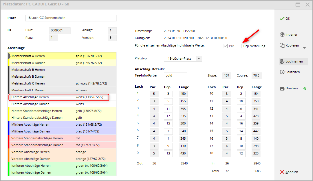 Dans l'aperçu à gauche, vous voyez directement les valeurs de Slope, CR et Par par départ. Si vous voulez voir les détails d'un tee, marquez le tee à gauche et vous verrez directement, par exemple, d'autres valeurs de par par trou pour le tee sélectionné !