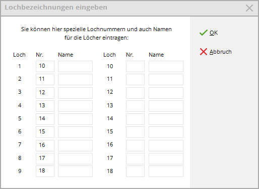 La répartition des donnes doit donc être saisie de manière correcte, de sorte que l'ordre soit le même pour 1-9 que pour 10-18. (Dans l'exemple, le trou 1 a la donne 1, donc la donne du trou 10, qui est le même trou qu'au premier tour, ne peut être que 2, le trou 2 a la donne 5, donc le trou 11 a la donne 6, etc. )
