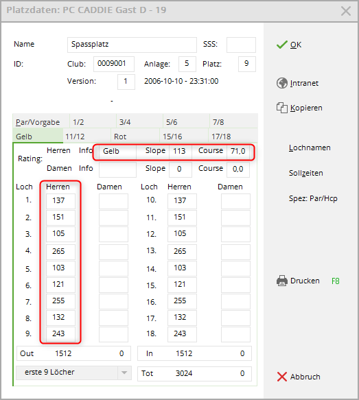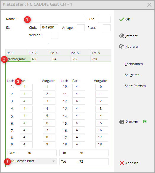 Situation au 24.07.2024 : L'Intranet de SwissGolf ne peut pas encore gérer des valeurs de par différentes, c.-à-d. que si vous avez besoin de valeurs de par différentes, par ex. pour un départ homme ROUGE, vous ne pouvez les adapter manuellement directement dans PC CADDIE qu'après avoir chargé les données du parcours depuis l'Intranet de SwissGolf !