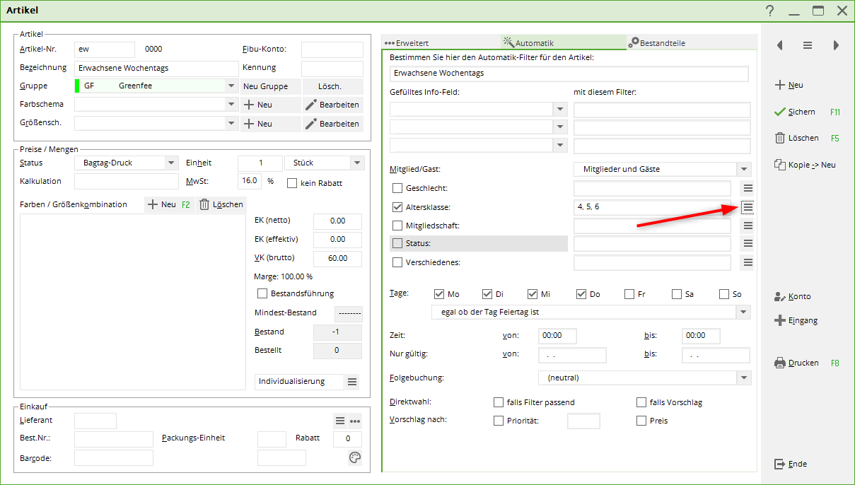 Si vous souhaitez par exemple que cet article ne soit valable que le lundi et uniquement pour les invités adultes, vous pouvez le faire via Membre/Invité, Classe d'âge et Jours définir en conséquence.