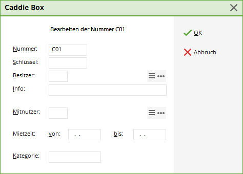 Activez le champ que vous souhaitez modifier (dans notre exemple : „Caddie-Box“) et confirmez avec OK ou la touche Enter, la fenêtre suivante apparaît.