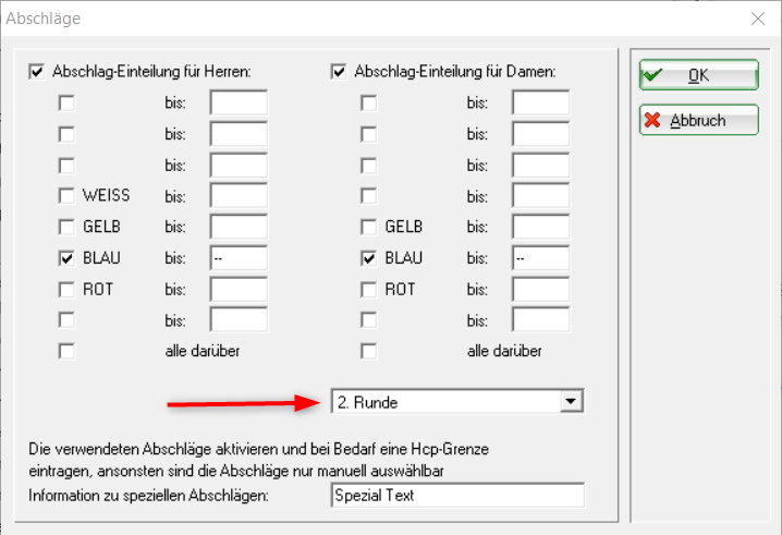 Dans les paramètres des données du tournoi, sous „Limite Hcp des départs“, les départs manuels sont indiqués par un „m“ :