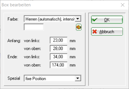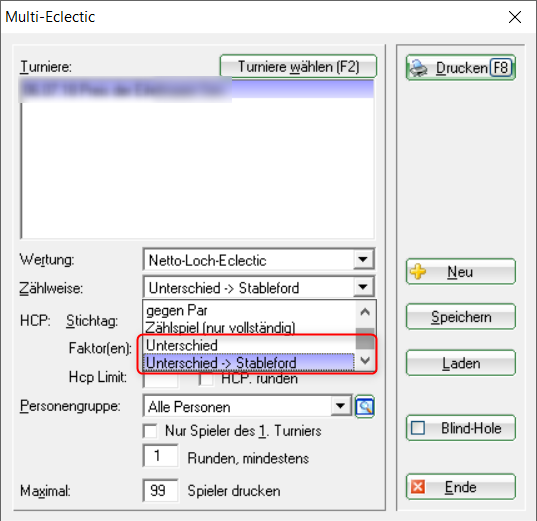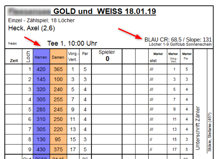 Sur les cartes de score, il est désormais possible d'imprimer la couleur de Tee correspondante (uniquement les couleurs standard : OR-ARGENT-NOIR-BLANC-JAUNE-BLEU-ORANGE-ROUGE-VERT). Pour cela, les éléments „Longueurs hommes, automatique“ et „Longueurs femmes, automatique“ doivent être combinés avec des éléments „Box“.