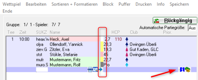 Si vous avez sélectionné un joueur directement dans l'éditeur de jeu - via le bouton „i“ - vous pouvez maintenant le voir à la couleur de son propre tee. Ces joueurs se distinguent visuellement des joueurs auxquels s'appliquent les départs du réglage de base des données du tournoi - visibles à la couleur attribuée par défaut.