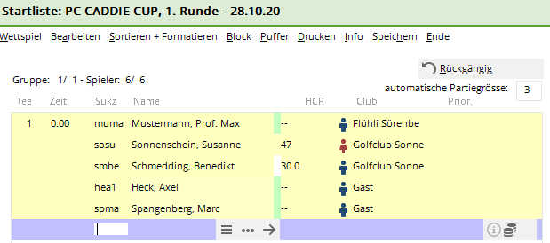 Si vous souhaitez reprendre une liste de départ uniquement à partir d'une compilation manuelle déjà prescrite (d'un sponsor par exemple), il vous suffit de saisir les joueurs les uns après les autres dans votre liste de départ vide à l'aide d'un code de recherche. Normalement, vous pouvez ensuite cliquer sur Enter pour passer à la suivante. Après la dernière entrée d'une partie, vous pouvez appuyer sur Ctrl + PgDn pour commencer un nouveau flight.
