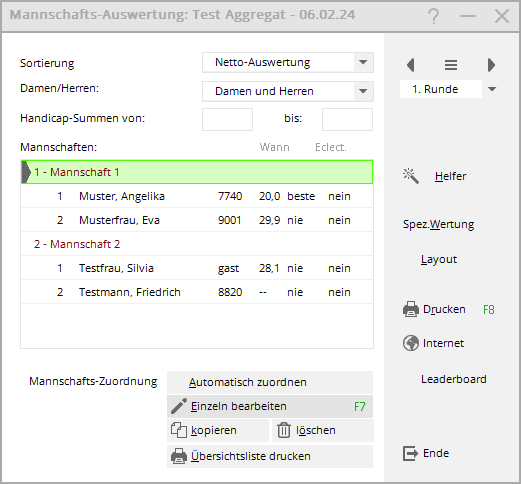 Vous voyez ici si tous les joueurs sont affectés à une équipe. En cliquant sur le bouton Helfer vous pouvez alors vous assurer, que tous les joueurs sont bien „Meilleurs au classement général“ ou que le classement est réglé ici.