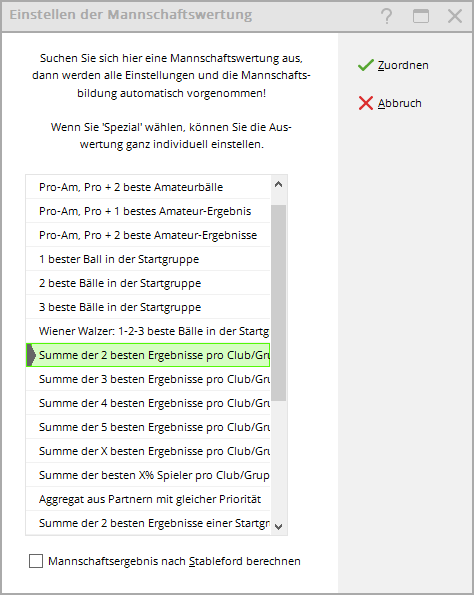 Sélectionner „Somme des 2 meilleurs résultats par club/groupe“ et cliquer sur Affecter.
