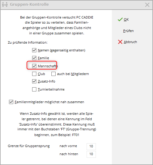 Lors de la création de la liste de départ, les joueurs appartenant à une même équipe peuvent être automatiquement séparés. Dans le „Contrôle de la composition“, cochez pour les parties Équipe. Ainsi, les joueurs qui appartiennent à une équipe sont attribués à des parties différentes :