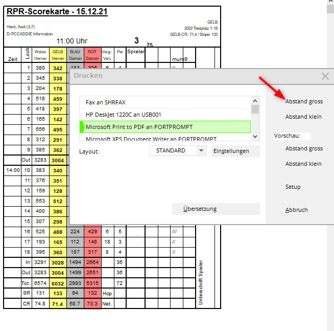 Dans ce qui suit, il est important d'imprimer également la carte de score pour le Marqueur. (même si elle n'est pas nécessaire de votre point de vue). Ce n'est qu'en imprimant également la carte de score du marqueur que les champs EXPORT nécessaires pour l'extranet DGV pourront être générés, afin que le marqueur puisse ensuite confirmer le score du joueur.