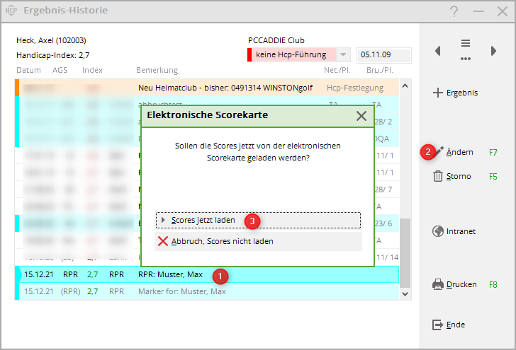 … et ici la possibilité d'envoyer à nouveau la carte de score d'un seul joueur au DGV-SERVICEPORTAL, ou de ne consulter que les résultats de ce joueur sur le DGV-SERVICPORTAL !