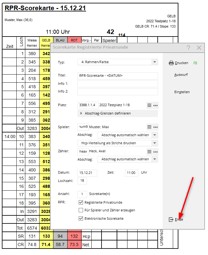 Ce n'est qu'après l'impression de la deuxième carte de score que vous pouvez terminer le processus en cliquant sur „Terminer“. Fin terminer !