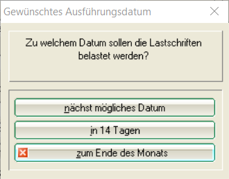 Dès que vous cliquez sur Éditer et que vous cochez ensuite la case pour Core ou Cor1, vous recevez la demande suivante la date à laquelle vous souhaitez encaisser la note de débit. La date est enregistrée dans le fichier et peut être utilisée directement pour débiter la note de débit. (nous y reviendrons plus tard). Pensez maintenant à nouveau si vous souhaitez éditer séparément les prélèvements suivants et initiaux, et cochez la case correspondante.