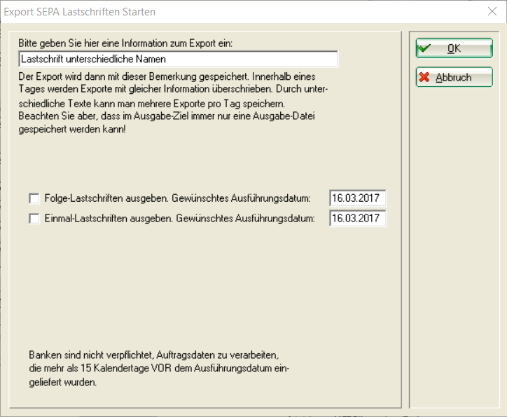 Si une banque rencontre encore des problèmes avec la version SEPA 3.0 pendant la phase de transition, il est encore possible d'éditer avec la version 2.7 (voir les instructions d'exportation jusqu'en 2017).