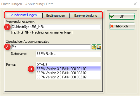 3. Plusieurs formats sont disponibles formats SEPA sont disponibles. Si votre banque ne supporte pas encore le format SEPA actuel 3.0 avec des fichiers XML PAIN.008.001.02, vous pouvez également choisir le format SEPA 2.7 avec des fichiers XML PAIN.008.003.02 ainsi que l'ancien format SEPA 2.6 avec des fichiers XML PAIN.008.002.02. Pendant la période de transition, vous pouvez choisir ici. De même, le format DTAUS est encore disponible.